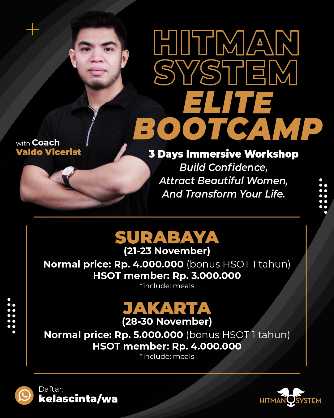 Elite Bootcamp memberikan semua pola pikir dan konsep teruji tentang cinta, romansa, dan dinamika sosial pria-wanita. Kamu juga akan akan belajar menguasai berbagai skill yang krusial dalam menjalin hubungan dengan wanita dan pergaulan sosial, yakni: