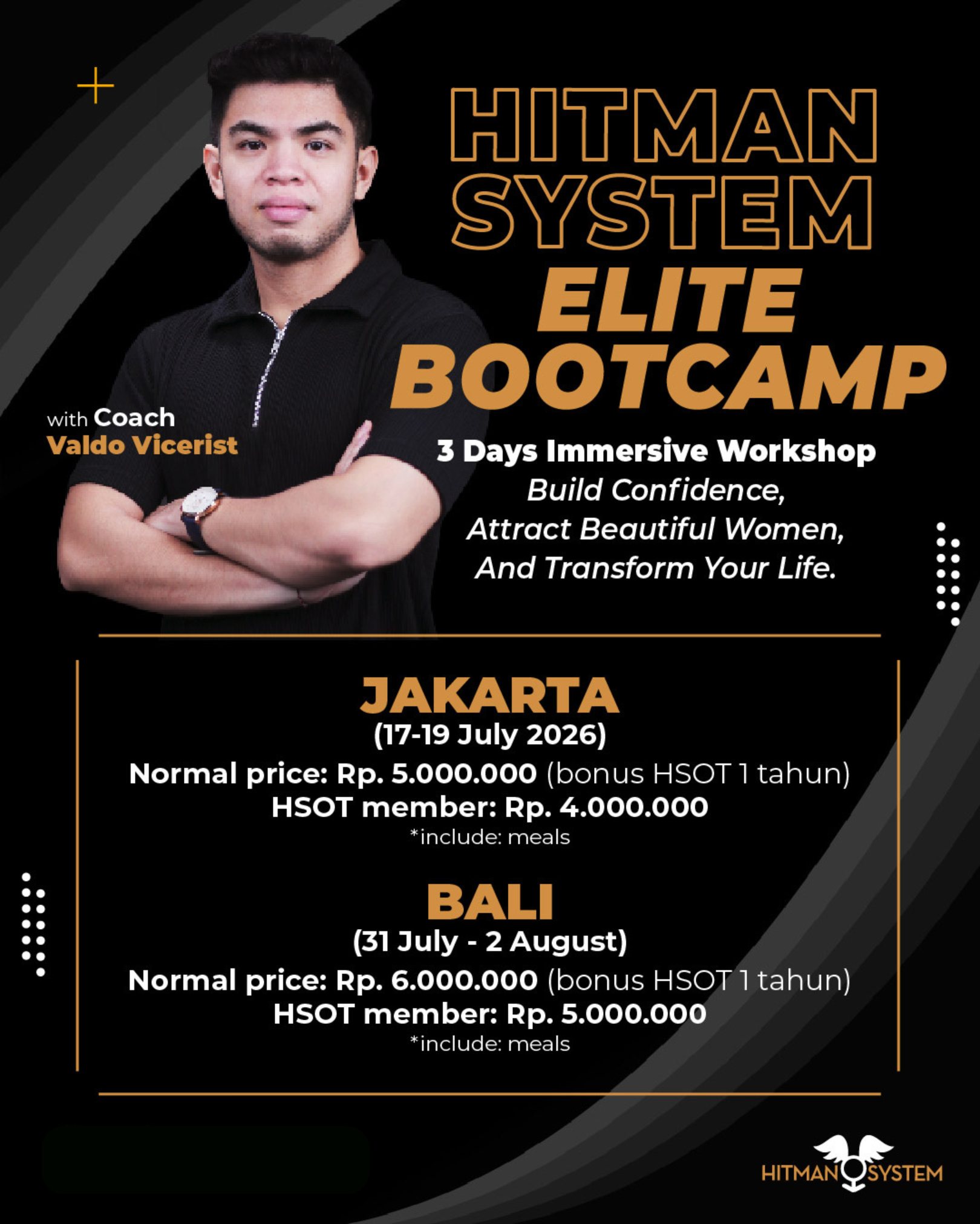 Elite Bootcamp berisi 20% teori, 30% diskusi, 50% simulasi dan praktek. Semua materi disusun agar kamu dapat merasakan sendiri betapa ASYIK dan MUDAHNYA mendekati wanita, terutama wanita-wanita asing di tempat publik. Kamu tidak perlu menunggu lama untuk merasakan perubahan, hasilnya bisa terasa nyata langsung pada detik itu juga di sepanjang pelatihan.